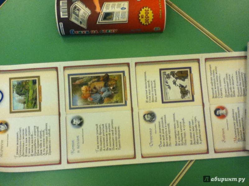 ОписаниеЧтобы ребёнок не отставал в развитии, Вы должны постоянно придумывать новые занятия.Особенно важно воспитать в нем чувство прекрасного, любовь к природе и хорошую память. Разучивание вместе с мамой стихотворений о природе прекрасно решает эту задачу.Однако, в продаже редко встречаются подборки стихов о природе, рассчитанные на маленьких детей, да и пользоваться книжкой для таких занятий обычно неудобно.Другое дело стихотворение, написанное крупным шрифтом с рисунками, которое висит на стене в самом оживленном месте квартиры. Маме будет удобно, пользуясь моментом, поэтапно, строфа за строфой выучить все стихотворение вместе с ребёнком. Покупая рулон "СТИХИ НА СТЕНУ", Вы получаете 22 прекрасных стихотворения о природе в рулоне 30х500 см, напечатанных крупным шрифтом с картинами русских художников.Вы выбираете стихотворение, вырезаете его из рулона, прикрепляете на стену и в любое удобное время разучиваете его вместе с ребёнком.Через некоторое время, Вы вырезаете следующее стихотворение и производите замену на стенеВоспитываем маленького любителя поэзии и природы!Для детей дошкольного и младшего школьного возраста.СвернутьЧтобы ребёнок не отставал в развитии, Вы должны постоянно придумывать новые занятия.Особенно важно воспитать в нем чувство прекрасного, любовь к природе и хорошую память. Разучивание вместе с мамой стихотворений о природе прекрасно решает эту задачу.Однако, в продаже редко встречаются подборки стихов о природе, рассчитанные на маленьких детей, да и пользоваться книжкой для таких занятий обычно неудобно.Другое дело стихотворение, написанное крупным шрифтом с рисунками, которое висит на стене в самом оживленном месте квартиры. Маме будет удобно, пользуясь моментом, поэтапно, строфа за строфой выучить все стихотворение вместе с ребёнком. Покупая рулон "СТИХИ НА СТЕНУ", Вы получаете 22 прекрасных стихотворения о природе в рулоне 30х500 см, напечатанных крупным шрифтом с картинами русских художников.Вы выбираете стихотворение, вырезаете его из рулона, прикрепляете на стену и в любое удобное время разучиваете его вместе с ребёнком.Через некоторое время, Вы вырезаете следующее стихотворение и производите замену на стенеВоспитываем маленького любителя поэзии и природы!Для детей дошкольного и младшего школьного возраста.СвернутьСвернуть