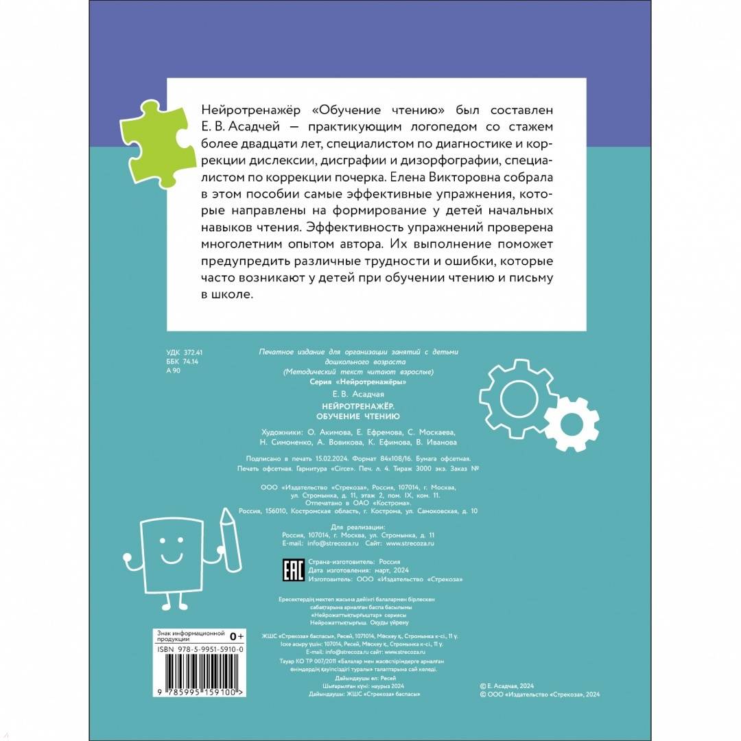 ОписаниеНейротренажёр "Обучение чтению" составлен Е. В. Асадчей - практикующим логопедом со стажем более двадцати лет, специалистом по диагностике и коррекции дислексии, дисграфии и дизорфографии, специалистом по коррекции почерка. Елена Викторовна собрала в этом пособии самые эффективные упражнения, которые направлены на формирование у детей начальных навыков чтения. Эффективность упражнений проверена многолетним опытом автора. Их выполнение поможет предупредить различные трудности и ошибки, которые часто возникают у детей при обучении чтению и письму в школе.Эту развивающую книгу могут использовать для организации занятий с девочкой или с мальчиком воспитатели, учителя, психологи, нейропсихологи, логопеды, дефектологи, а также родители, которые занимаются с детьми самостоятельно.Нейротренажёр "Обучение чтению" составлен Е. В. Асадчей - практикующим логопедом со стажем более двадцати лет, специалистом по диагностике и коррекции дислексии, дисграфии и дизорфографии, специалистом по коррекции почерка. Елена Викторовна собрала в этом пособии самые эффективные упражнения, которые направлены на формирование у детей начальных навыков чтения. Эффективность упражнений проверена многолетним опытом автора. Их выполнение поможет предупредить различные трудности и ошибки, которые часто возникают у детей при обучении чтению и письму в школе.Эту развивающую книгу могут использовать для организации занятий с девочкой или с мальчиком воспитатели, учителя, психологи, нейропсихологи, логопеды, дефектологи, а также родители, которые занимаются с детьми самостоятельно.