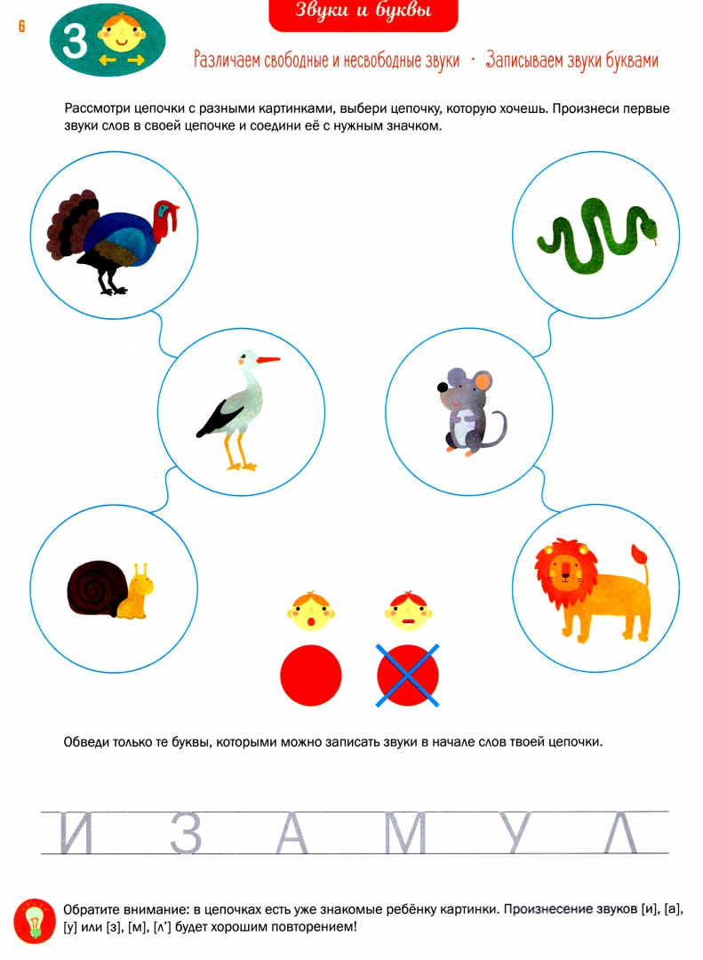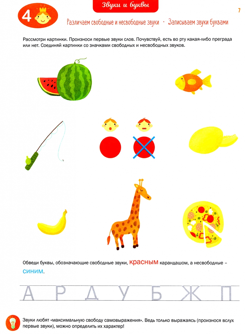 Описание- Учимся правильно произносить самые разные звуки в словах.Обращаем внимание на то, что одни Звуки произносятся свободно (без преград во рту), а другие - несвободно, потому что на их пути встречаются разные преграды (губы, зубы, язык, сжатие горлышка). В школе свободные звуки называются "гласные", а несвободные звуки - "согласные".- Исследуем несвободные звуки и выясняем, что они могут быть "сильными" - звонкими (звонят, как колокольчики) и "слабыми" _ глухими (звон пропадает, остаётся только свист и шум). Не останавливаемся на достигнутом! Продолжаем исследование несвободных звуков и выясняем, что они могут быть твёрдыми (как льдинка) и мягкими (словно травка).- Осваиваем звуковое письмо, чтобы хорошо представлять звуковой состав слова: записываем слова кружками-звуками последовательно, один за другим(так, как произносим их в том или ином слове).- Учимся правильно произносить самые разные звуки в словах.Обращаем внимание на то, что одни Звуки произносятся свободно (без преград во рту), а другие - несвободно, потому что на их пути встречаются разные преграды (губы, зубы, язык, сжатие горлышка). В школе свободные звуки называются "гласные", а несвободные звуки - "согласные".- Исследуем несвободные звуки и выясняем, что они могут быть "сильными" - звонкими (звонят, как колокольчики) и "слабыми" _ глухими (звон пропадает, остаётся только свист и шум). Не останавливаемся на достигнутом! Продолжаем исследование несвободных звуков и выясняем, что они могут быть твёрдыми (как льдинка) и мягкими (словно травка).- Осваиваем звуковое письмо, чтобы хорошо представлять звуковой состав слова: записываем слова кружками-звуками последовательно, один за другим(так, как произносим их в том или ином слове).