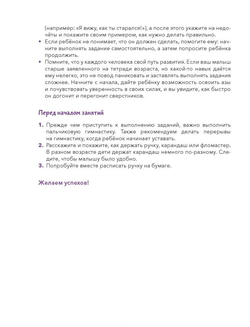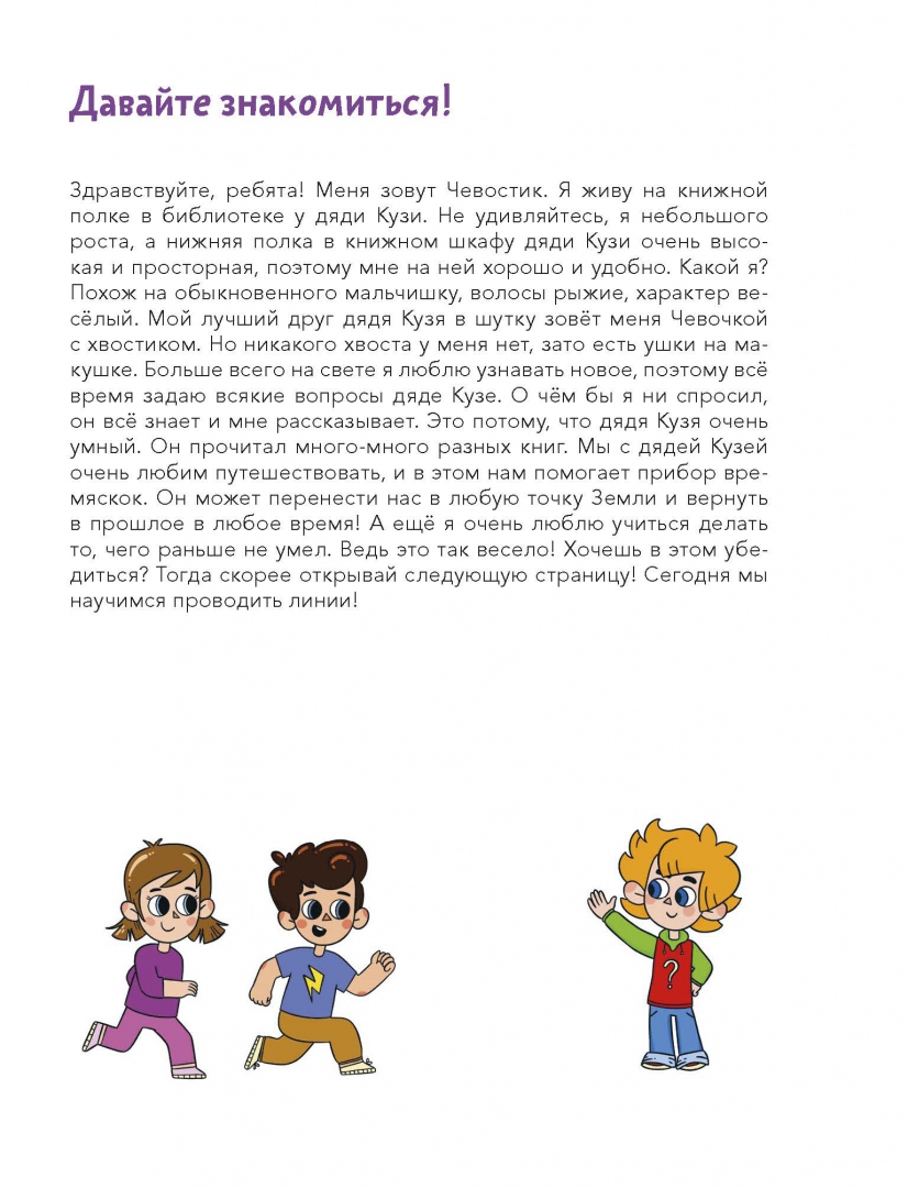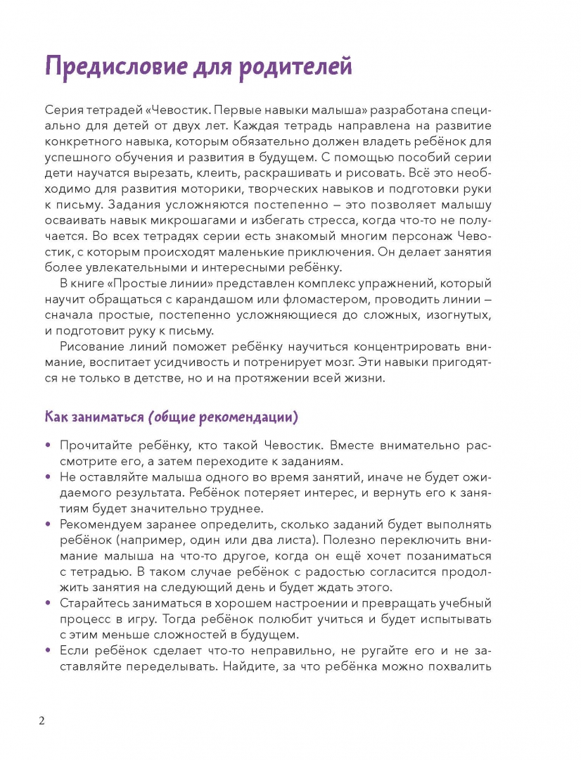 ОписаниеНовая серия развивающих тетрадей для самых маленьких с любимым героем Чевостиком!Благодаря тетради ребёнок научится обращаться с карандашом или фломастером, проводить линии — сначала простые, затем сложные изогнутые, подготовит руку к письму.Во время занятий ребенок научится концентрировать внимание, потренирует мозг и мелкую моторику, станет усидчивее. Эти навыки пригодятся не только в детстве, но и на протяжении всей жизни.О серииСерия тетрадей «Чевостик. Первые навыки малыша» создана для занятий с детьми от 2 лет и направлена на развитие ключевых навыков, без которых ребёнок не сможет обойтись в дальнейшем обучении. С помощью тетрадей серии ребёнок научится вырезать, клеить, рисовать, раскрашивать, проходить лабиринты и проводить линии, будет развивать моторику рук, внимательность, усидчивость, логическое и творческое мышление.Каждое задание тетради — маленькая игра. Все упражнения усложняются постепенно и объединены общим сюжетом, что добавляет ребенку интереса к занятиям. На каждой странице с Чевостиком что-то происходит, малышу хочется узнать, что будет дальше, и он вовлекается в процесс обучения.Фишки серии— Продуманные задания, которые постепенно усложняются.— Любимый герой, с которым открывать новое гораздо веселее.— Тетради построены по принципу микрошагов, что помогает осваивать навыки без стресса.— Пособия помогут ребёнку легко научиться вырезать, клеить, раскрашивать, рисовать, даже если раньше он этого никогда не делал.— Каждое задание — небольшая игра, благодаря которой ребёнку будет интересно заниматься и он не станет скучать.Как заниматься по тетради— Прочитайте ребёнку, кто такой Чевостик. Вместе внимательно рассмотрите его, а затем переходите к заданиям.— Не оставляйте малыша одного во время занятий, иначе не будет ожидаемого результата. Ребёнок потеряет интерес, и вернуть его к занятиям будет значительно труднее.— Рекомендуем заранее определить, сколько заданий будет выполнять ребёнок (например, один или два листа). Полезно переключить внимание малыша на что-то другое, когда он ещё хочет позаниматься с тетрадью. В таком случае ребёнок с радостью согласится продолжить занятия на следующий день и будет ждать этого.— Старайтесь заниматься в хорошем настроении и превращать учебный процесс в игру. Тогда ребёнок полюбит учиться и будет испытывать с этим меньше сложностей в будущем.— Если ребёнок сделает что-то неправильно, не ругайте его и не заставляйте переделывать. Найдите, за что ребёнка можно похвалить (например: «Я вижу, как ты старался!»), а после этого укажите на недочёты и покажите своим примером, как нужно делать правильно.— Если ребёнок не понимает, что он должен сделать, помогите ему: начните выполнять задание самостоятельно, а затем попросите ребёнка продолжить.— Помните, что у каждого человека свой путь развития. Если ваш малыш старше заявленного на тетради возраста, но какой-то навык даётся ему нелегко, это не повод паниковать и заставлять выполнять задания сложнее. Начните с начала, дайте ребёнку возможность освоить азы и почувствовать уверенность в своих силах, и вы увидите, как быстро он догонит и перегонит сверстников.Почему решили издать книгуАналог популярной серии «Kumon», но с любимым персонажем Чевостиком и интересным сквозным сюжетом.Для кого эта книгаДля де
