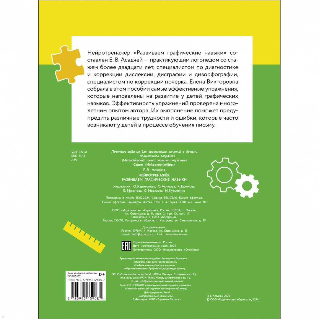 ОписаниеНейротренажёр "Развиваем графические навыки" составлен Е. В. Асадчей - практикующим логопедом со стажем более двадцати лет, специалистом по диагностике и коррекции дислексии, дисграфии и дизорфографии, специалистом по коррекции почерка. Елена Викторовна собрала в этом пособии самые эффективные упражнения, которые направлены на развитие у детей графических навыков. Эффективность упражнений проверена многолетним опытом автора. Их выполнение поможет предупредить различные трудности и ошибки, которые часто возникают у детей в процессе обучения письму.Эту развивающую книгу могут использовать для организации занятий с девочкой или с мальчиком воспитатели, учителя, психологи, нейропсихологи, логопеды, дефектологи, а также родители, которые занимаются с детьми самостоятельно.Нейротренажёр "Развиваем графические навыки" составлен Е. В. Асадчей - практикующим логопедом со стажем более двадцати лет, специалистом по диагностике и коррекции дислексии, дисграфии и дизорфографии, специалистом по коррекции почерка. Елена Викторовна собрала в этом пособии самые эффективные упражнения, которые направлены на развитие у детей графических навыков. Эффективность упражнений проверена многолетним опытом автора. Их выполнение поможет предупредить различные трудности и ошибки, которые часто возникают у детей в процессе обучения письму.Эту развивающую книгу могут использовать для организации занятий с девочкой или с мальчиком воспитатели, учителя, психологи, нейропсихологи, логопеды, дефектологи, а также родители, которые занимаются с детьми самостоятельно.