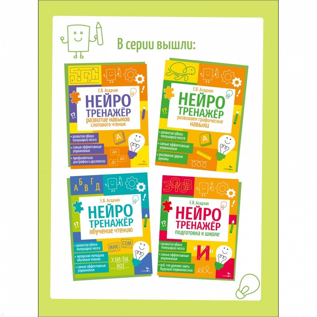--Елена Асадчая: Нейротренажер. Развиваем графические навыкиКниги для учителейСловари и разговорникиДошкольное обучениеКниги для родителейПособия для детей с ограниченными возможностямиДополнительное образование для детейПедагогикаПодготовка в вузДемонстрационные материалыИностранные языки: грамматика и учебникиКниги для школыВспомогательные материалы для студентов