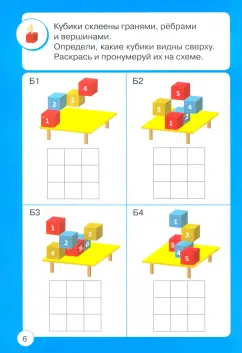 ОписаниеРешение 3D-задач – увлекательное и полезное занятие. Оно поможет сформировать пространственные представления, то есть умение оценивать размер, форму, местоположение трёхмерных объектов и взаимосвязь между ними. Благодаря этому мы ориентируемся на местности, решаем задачи по геометрии, можем мысленно «переставить» мебель в комнате.Дети не хуже взрослых видят скрытые фрагменты объёмных фигур и могут мысленно их достраивать. Нужно только немного потренироваться. В этом вам поможет издание, которое вы держите в руках.Самым удобным и понятным материалом для развития пространственных представлений являются кубики. Чтобы маленький ученик уяснил принцип действий с проекциями, первые и наиболее простые задания лучше выполнить с реальными кубиками, собрав фигуру на столе. Затем можно переходить к упражнениям на бумаге.Решение предложенных в издании задач будет содействовать формированию пространственных представлений, развитию речи, активизации воображения, в том числе творческого.Издание может быть использовано при проведении факультативных занятий, в группе продлённого дня, будет полезно для организации семейного досуга.Для детей старшего дошкольного и младшего школьного возрастаСвернутьРешение 3D-задач – увлекательное и полезное занятие. Оно поможет сформировать пространственные представления, то есть умение оценивать размер, форму, местоположение трёхмерных объектов и взаимосвязь между ними. Благодаря этому мы ориентируемся на местности, решаем задачи по геометрии, можем мысленно «переставить» мебель в комнате.Дети не хуже взрослых видят скрытые фрагменты объёмных фигур и могут мысленно их достраивать. Нужно только немного потренироваться. В этом вам поможет издание, которое вы держите в руках.Самым удобным и понятным материалом для развития пространственных представлений являются кубики. Чтобы маленький ученик уяснил принцип действий с проекциями, первые и наиболее простые задания лучше выполнить с реальными кубиками, собрав фигуру на столе. Затем можно переходить к упражнениям на бумаге.Решение предложенных в издании задач будет содействовать формированию пространственных представлений, развитию речи, активизации воображения, в том числе творческого.Издание может быть использовано при проведении факультативных занятий, в группе продлённого дня, будет полезно для организации семейного досуга.Для детей старшего дошкольного и младшего школьного возрастаСвернутьСвернуть