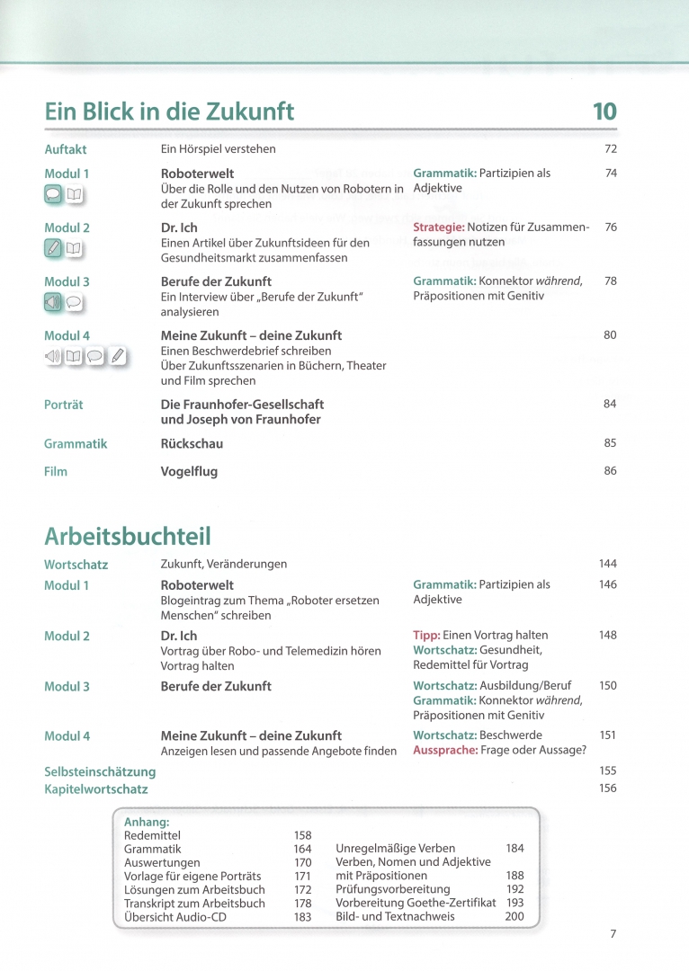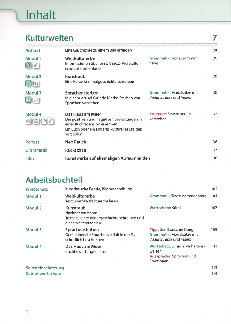 ОписаниеДанное печатное издание представляет собой совмещенные под одной обложкой вторую половину полной версии учебника (6-10 разделы) и соответствующие разделы рабочей тетради, с доступом к цифровым версиям учебника и рабочей тетради с аудио и видеоматериалами на платформе BlinkLearning, с аудиоматериалами на диске.Aspekte neu – трехуровневый курс немецкого языка для учащихся средней школы, желающих углубить свои знания немецкого языка уровня B1 и уверенно перейти на уровень C1. Интересные темы и тексты, представленные в курсе, а также четко поставленные цели обучения поддерживают процесс обучения. Учебник предлагает студентам ситуации общения из реальной жизни. В каждом уровне представлено десять разноплановых описаний людей, компаний или организаций. Курс готовит к экзаменам по немецкому языку, консолидируя и расширяя структуру языка и тренируя навыки и экзаменационные стратегии. В учебнике есть сборник полезных выражений и идиом и справочник по грамматике. Учебник можно использовать разными способами: идти по порядку или в первую очередь выбирать наиболее актуальные модули.Рабочая тетрадь дополняет языковой материал учебника и помогает его еще раз потренировать в классе или самостоятельно дома, отработать навыки и стратегии при подготовке к экзаменам Goethe-Zertifikat, TELC Deutsch и Österreichisches Sprachdiplom Deutsch (ÖSD). В конце каждого модуля в рабочей тетради есть список слов и выражений и задания на формирование навыка самооценки. В конце рабочей тетради представлен список неправильных глаголов, список глаголов с предлогами, список глаголов с дательным падежом, список глаголов с дательным и винительным падежом, список возвратных глаголов, тексты аудиозаписей и ответы к заданиям, а также содержится другая информация справочного характера.На диске размещены аудиозаписи к заданиям из рабочей тетради.Lehr- und Arbeitsbuch mit Audios inklusive Lizenzcode fur das Lehr- und Arbeitsbuch mit interaktiven Ubungen Teil 2.Dieses Media Bundle besteht aus dem gedruckten Buch und einem Lizenzcode zur Aktivierung der Digitalen Ausgabe mit LMS.Den Lizenzcode finden Sie im Buch.СвернутьДанное печатное издание представляет собой совмещенные под одной обложкой вторую половину полной версии учебника (6-10 разделы) и соответствующие разделы рабочей тетради, с доступом к цифровым версиям учебника и рабочей тетради с аудио и видеоматериалами на платформе BlinkLearning, с аудиоматериалами на диске.Aspekte neu – трехуровневый курс немецкого языка для учащихся средней школы, желающих углубить свои знания немецкого языка уровня B1 и уверенно перейти на уровень C1. Интересные темы и тексты, представленные в курсе, а также четко поставленные цели обучения поддерживают процесс обучения. Учебник предлагает студентам ситуации общения из реальной жизни. В каждом уровне представлено десять разноплановых описаний людей, компаний или организаций. Курс готовит к экзаменам по немецкому языку, консолидируя и расширяя структуру языка и тренируя навыки и экзаменационные стратегии. В учебнике есть сборник полезных выражений и идиом и справочник по грамматике. Учебник можно использовать разными способами: идти по порядку или в первую очередь выбирать наиболее актуальные модули.Рабочая тетрадь дополняет языковой материал учебника и помогает его еще раз потренировать в классе или самостоятельно дома, отработать навыки и стратегии при подготовке к экзаменам Goethe-Zertifikat, TELC Deutsch и Österreichisches Sprachdiplom Deutsch (ÖSD).