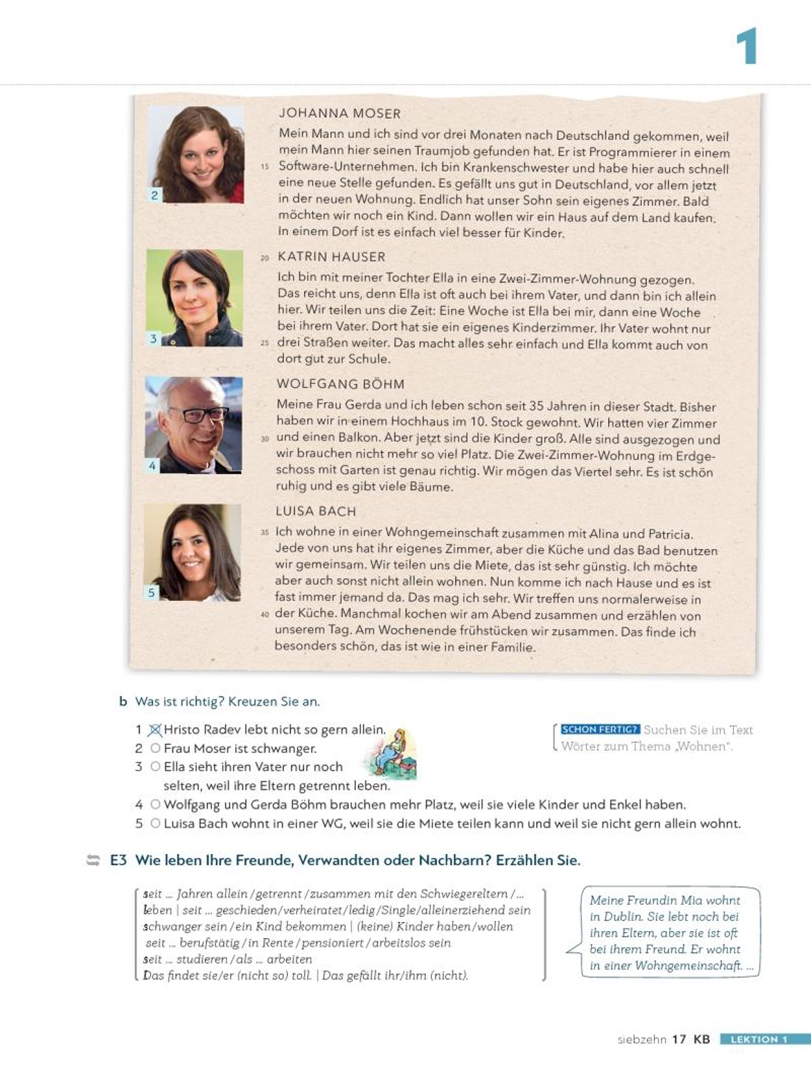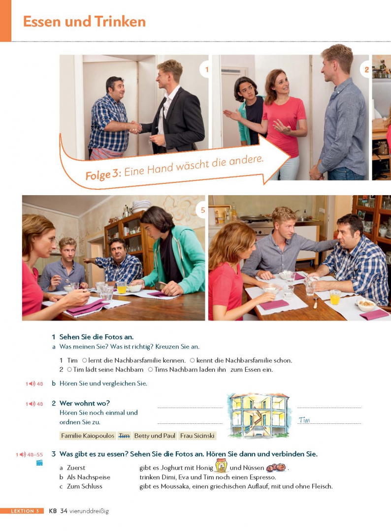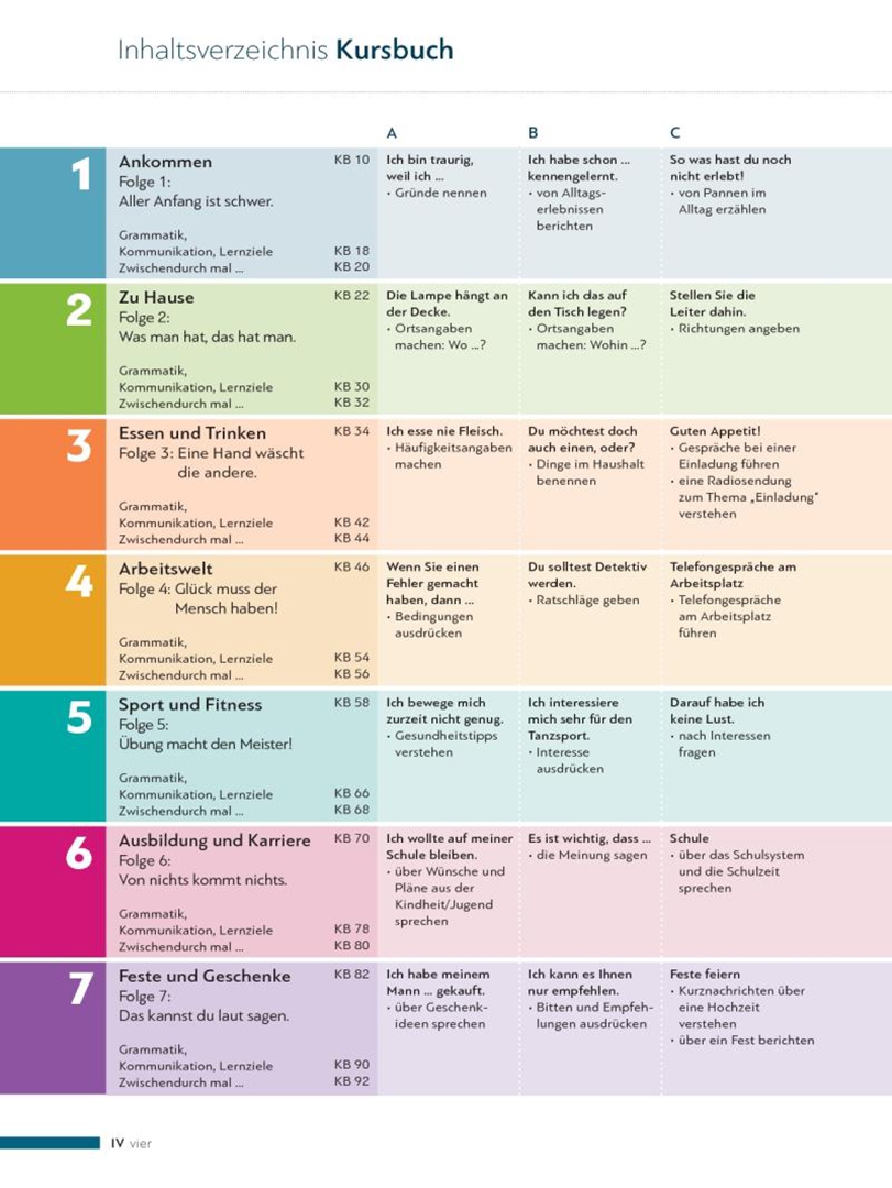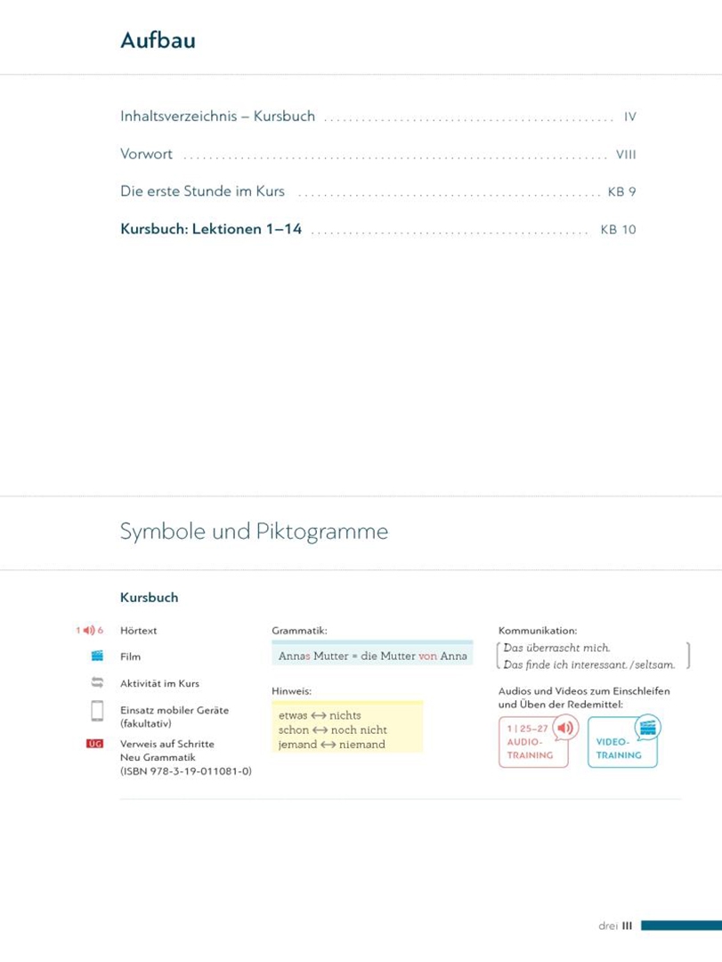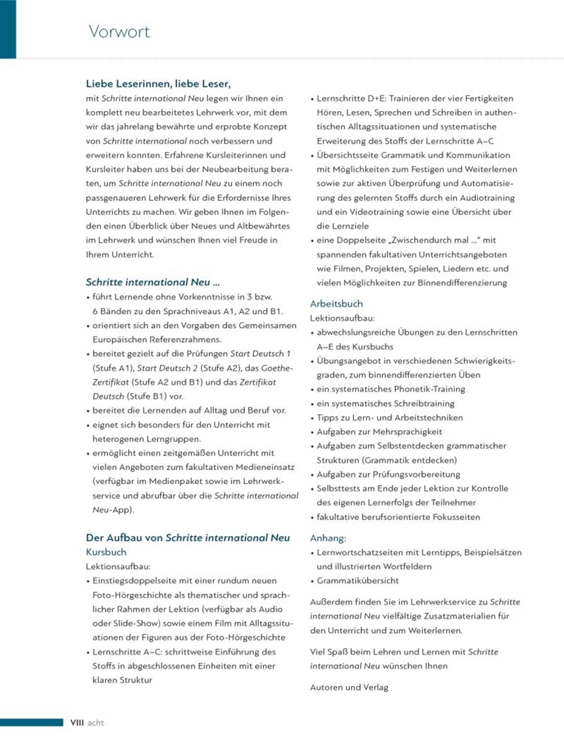 ОписаниеSchritte international Neu – обновленная и дополненная версия проверенного курса Schritte international для молодежи и взрослых (A1 – B1). Курс направлен на ознакомление учащихся и их подготовку к повседневной жизни и работе в немецкоговорящих странах. Учебник имеет четкую структуру для высокой прозрачности обучения: он состоит из 14 разделов, материал каждого из которых соответствует одной из актуальных для повседневной жизни и работы тем (еда и напитки, здоровье, развлечения и т.д.). Раздел начинается с занимательной, подходящей по теме фотоаудиоистории, персонажи которой в увлекательной форме познакомят студентов с языком и его особенностями. Также учебник содержит интересные тексты для чтения, материалы по краеведению, упражнения и страницы для самостоятельного обучения грамматике и средствам коммуникации.Lehrwerk für Anfänger, die zielgerichtet Deutsch lernen und sich auf das Zertifikat Deutsch B1 vorbereiten wollen.Grundlegende Überarbeitung des bewährten Lehrwerks mithilfe von Rückmeldungen von Kursleitern aus verschiedenen Ländern (Europa, Asien, Latein/Südamerika).Vollband Niveau A2- Hoher emotionaler Faktor durch neue Foto-Hörgeschichte- Audiovisuelle Elemente bereichern die Lektionen (verschiedene Videos)- Mehr Lernhilfen: Genusmarkierungen, Formensymbolik für Verb/Subjekt- Große Anzahl (gut angebundener) Kranzprodukte, vorallem im digitalen BereichСвернутьSchritte international Neu – обновленная и дополненная версия проверенного курса Schritte international для молодежи и взрослых (A1 – B1). Курс направлен на ознакомление учащихся и их подготовку к повседневной жизни и работе в немецкоговорящих странах. Учебник имеет четкую структуру для высокой прозрачности обучения: он состоит из 14 разделов, материал каждого из которых соответствует одной из актуальных для повседневной жизни и работы тем (еда и напитки, здоровье, развлечения и т.д.). Раздел начинается с занимательной, подходящей по теме фотоаудиоистории, персонажи которой в увлекательной форме познакомят студентов с языком и его особенностями. Также учебник содержит интересные тексты для чтения, материалы по краеведению, упражнения и страницы для самостоятельного обучения грамматике и средствам коммуникации.Lehrwerk für Anfänger, die zielgerichtet Deutsch lernen und sich auf das Zertifikat Deutsch B1 vorbereiten wollen.Grundlegende Überarbeitung des bewährten Lehrwerks mithilfe von Rückmeldungen von Kursleitern aus verschiedenen Ländern (Europa, Asien, Latein/Südamerika).Vollband Niveau A2- Hoher emotionaler Faktor durch neue Foto-Hörgeschichte- Audiovisuelle Elemente bereichern die Lektionen (verschiedene Videos)- Mehr Lernhilfen: Genusmarkierungen, Formensymbolik für Verb/Subjekt- Große Anzahl (gut angebundener) Kranzprodukte, vorallem im digitalen BereichСвернутьСвернуть