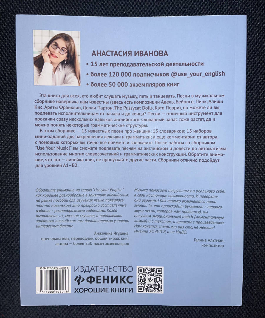 В этом сборнике 15 известных песен про женщин; 15 словариков; 15 наборов мини-заданий для закрепления лексики и грамматики; комментарии от автора, с помощью которых у вас точно получится всё понять и запомнить. После работы со сборником Use Your Music! вы сможете подпевать песням на английском и довести до автоматизма использование многих словосочетаний и грамматических конструкций.