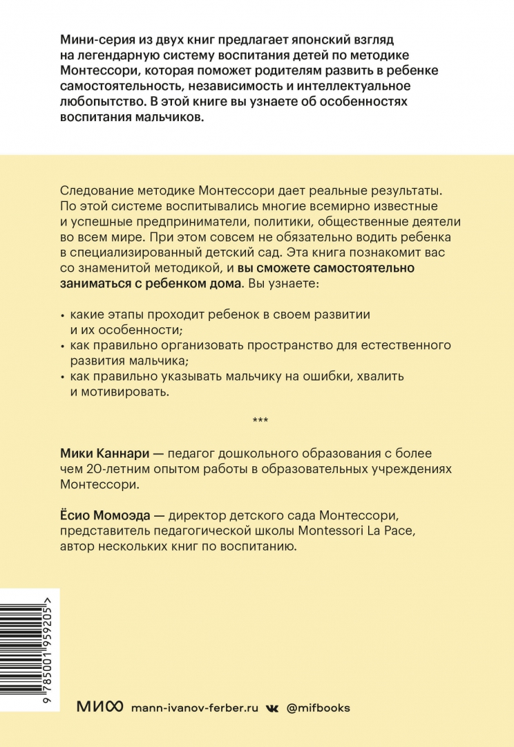 ОписаниеМини-серия из двух книг предлагает японский взгляд на легендарную систему воспитания детей по методике Монтессори, которая поможет родителям развить в ребенке самостоятельность, независимость и интеллектуальное любопытство. В этой книге вы узнаете об особенностях воспитания мальчиков.Следование методике Монтессори дает реальные результаты. По этой системе воспитывались многие всемирно известные и успешные предприниматели, политики, общественные деятели во всем мире. При этом совсем не обязательно водить ребенка в специализированный детский сад. Эта книга познакомит вас со знаменитой методикой, и вы сможете самостоятельно заниматься с ребенком дома. Вы узнаете:- какие этапы проходит ребенок в своем развитии и их особенности;- как правильно организовать пространство для естественного развития мальчика;- как правильно указывать мальчику на ошибки, хвалить и мотивировать.Эта книга поможет родителям лучше понимать поведение своего сына и действовать так, чтобы раскрыть его способности и таланты. Книги этой мини-серии переиздавались 6 раз.Мики Каннари, педагог дошкольного образования с более чем 20-летним опытом работы в образовательных учреждениях Монтессори. Ёсио Момоэда, директор детского сада Монтессори, представитель педагогической школы Montessori La Pace, автор нескольких книг по воспитанию.СвернутьМини-серия из двух книг предлагает японский взгляд на легендарную систему воспитания детей по методике Монтессори, которая поможет родителям развить в ребенке самостоятельность, независимость и интеллектуальное любопытство. В этой книге вы узнаете об особенностях воспитания мальчиков.Следование методике Монтессори дает реальные результаты. По этой системе воспитывались многие всемирно известные и успешные предприниматели, политики, общественные деятели во всем мире. При этом совсем не обязательно водить ребенка в специализированный детский сад. Эта книга познакомит вас со знаменитой методикой, и вы сможете самостоятельно заниматься с ребенком дома. Вы узнаете:- какие этапы проходит ребенок в своем развитии и их особенности;- как правильно организовать пространство для естественного развития мальчика;- как правильно указывать мальчику на ошибки, хвалить и мотивировать.Эта книга поможет родителям лучше понимать поведение своего сына и действовать так, чтобы раскрыть его способности и таланты. Книги этой мини-серии переиздавались 6 раз.Мики Каннари, педагог дошкольного образования с более чем 20-летним опытом работы в образовательных учреждениях Монтессори. Ёсио Момоэда, директор детского сада Монтессори, представитель педагогической школы Montessori La Pace, автор нескольких книг по воспитанию.СвернутьСвернуть