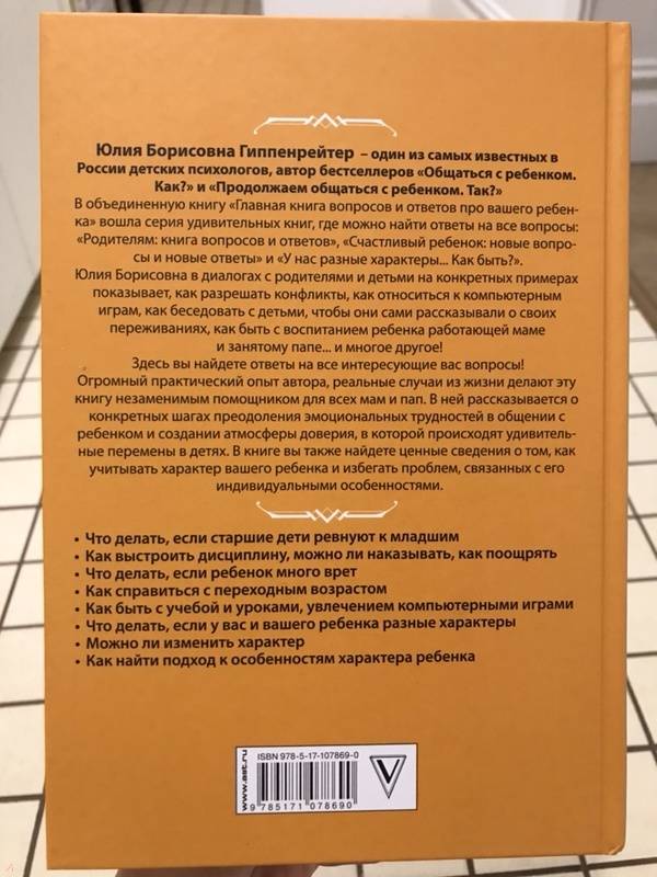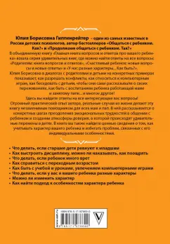 ОписаниеЮлия Борисовна Гиппенрейтер - одна из самых известных в России детских психологов, автор бестселлеров "Общаться с ребенком. Как?" и "Продолжаем общаться с ребенком. Так?"В объединенную книгу "Главная книга вопросов и ответов про вашего ребенка" вошла серия удивительных книг, где можно найти ответы на все вопросы:"Родителям: книга вопросов и ответов", "Счастливый ребенок: новые вопросы и новые ответы" и "У нас разные характеры... Как быть?". Юлия Борисовна в диалогах с родителями и детьми на конкретных примерах показывает, как разрешать конфликты, как относиться к компьютерным играм, как беседовать с детьми, чтобы они сами рассказывали о своих переживаниях, как быть с воспитанием ребенка работающей маме и занятому папе... и многое другое!Здесь вы найдете ответы на все интересующие вас вопросы! Огромный практический опыт автора, реальные случаи из жизни делают эту книгу незаменимым помощником для всех мам и пап. В ней рассказывается о конкретных шагах преодоления эмоциональных трудностей в общении с ребенком и создании атмосферы доверия, в которой происходят удивительные перемены в детях. В книге вы также найдете ценные сведения о том, как учитывать характер вашего ребенка и избегать проблем, связанных с его индивидуальными особенностями.СвернутьЮлия Борисовна Гиппенрейтер - одна из самых известных в России детских психологов, автор бестселлеров "Общаться с ребенком. Как?" и "Продолжаем общаться с ребенком. Так?"В объединенную книгу "Главная книга вопросов и ответов про вашего ребенка" вошла серия удивительных книг, где можно найти ответы на все вопросы:"Родителям: книга вопросов и ответов", "Счастливый ребенок: новые вопросы и новые ответы" и "У нас разные характеры... Как быть?". Юлия Борисовна в диалогах с родителями и детьми на конкретных примерах показывает, как разрешать конфликты, как относиться к компьютерным играм, как беседовать с детьми, чтобы они сами рассказывали о своих переживаниях, как быть с воспитанием ребенка работающей маме и занятому папе... и многое другое!Здесь вы найдете ответы на все интересующие вас вопросы! Огромный практический опыт автора, реальные случаи из жизни делают эту книгу незаменимым помощником для всех мам и пап. В ней рассказывается о конкретных шагах преодоления эмоциональных трудностей в общении с ребенком и создании атмосферы доверия, в которой происходят удивительные перемены в детях. В книге вы также найдете ценные сведения о том, как учитывать характер вашего ребенка и избегать проблем, связанных с его индивидуальными особенностями.СвернутьСвернуть