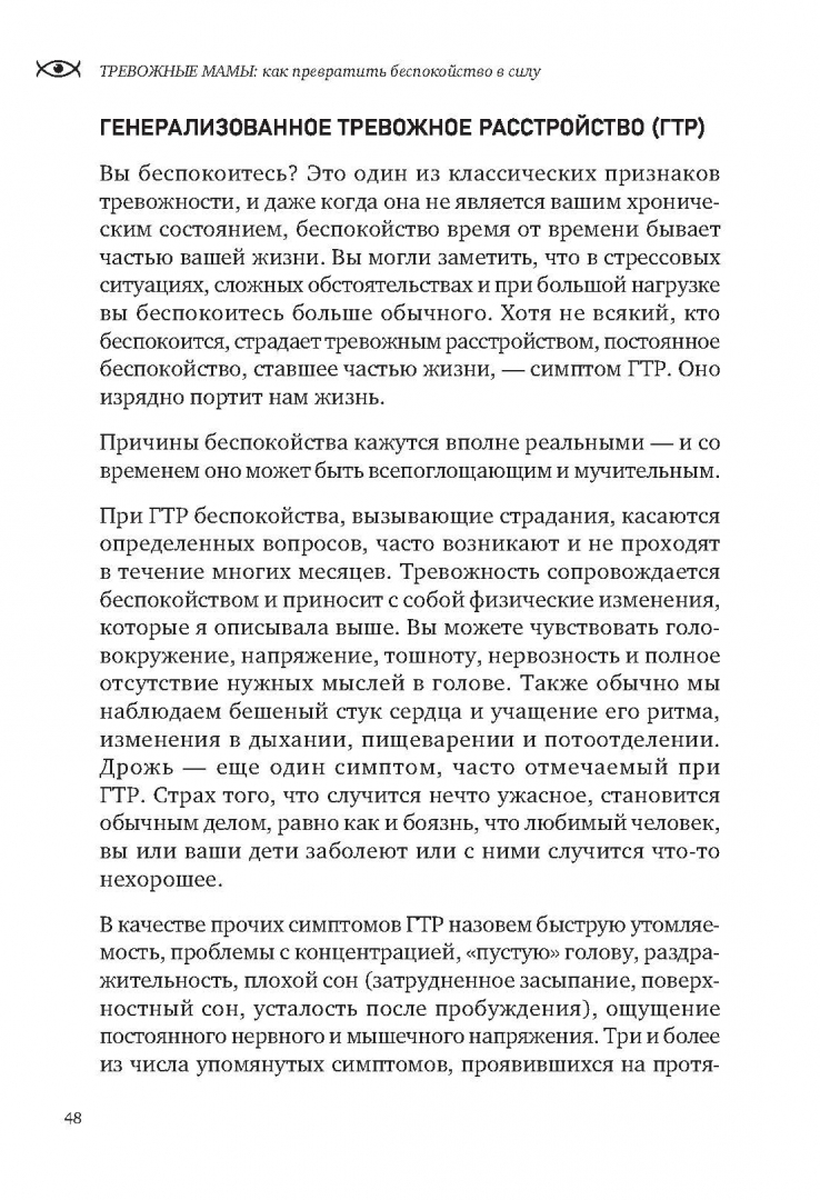ОписаниеЕсли вы считаете, что беспокоиться - естественно, но при этом часто болеете, испытываете головокружения, учащенное сердцебиение, проблемы со сном - не списывайте это на особенности женского организма. Причиной таких "необъяснимых" симптомов может быть недиагностированное тревожное расстройство. "Неуправляемая тревожность превращает жизнь в пытку. С известия о беременности до рождения ребенка и дальше - причин для беспокойства у женщин хоть отбавляй. Я знаю. Я сама была такой. Но страдать не обязательно. Я расскажу, как справиться с тревогой и уменьшить громкость пожарной сигнализации, постоянно звучащей в мозгу". Благодаря книге вы сможете оценить индивидуальные биологические основы вашей тревожности и понять, когда достаточно доверительного разговора с подругой за чашкой чая, а когда нужна помощь профессионала. Вы научитесь: - уважать свои чувства и заботиться о себе: это сделает счастливее всех членов семьи; - усмирять демонов тревоги, устанавливая границу между реальностью и паникой в мыслях; - находить время на то, чтобы соблюдать здоровый режим дня, питания, физической активности - несмотря на нехватку часов в сутках, знакомую каждой матери. Книга будет полезна женщинам на любом этапе материнства и специалистам, работающим с тревожными расстройствами.СвернутьЕсли вы считаете, что беспокоиться - естественно, но при этом часто болеете, испытываете головокружения, учащенное сердцебиение, проблемы со сном - не списывайте это на особенности женского организма. Причиной таких "необъяснимых" симптомов может быть недиагностированное тревожное расстройство. "Неуправляемая тревожность превращает жизнь в пытку. С известия о беременности до рождения ребенка и дальше - причин для беспокойства у женщин хоть отбавляй. Я знаю. Я сама была такой. Но страдать не обязательно. Я расскажу, как справиться с тревогой и уменьшить громкость пожарной сигнализации, постоянно звучащей в мозгу". Благодаря книге вы сможете оценить индивидуальные биологические основы вашей тревожности и понять, когда достаточно доверительного разговора с подругой за чашкой чая, а когда нужна помощь профессионала. Вы научитесь: - уважать свои чувства и заботиться о себе: это сделает счастливее всех членов семьи; - усмирять демонов тревоги, устанавливая границу между реальностью и паникой в мыслях; - находить время на то, чтобы соблюдать здоровый режим дня, питания, физической активности - несмотря на нехватку часов в сутках, знакомую каждой матери. Книга будет полезна женщинам на любом этапе материнства и специалистам, работающим с тревожными расстройствами.СвернутьСвернуть