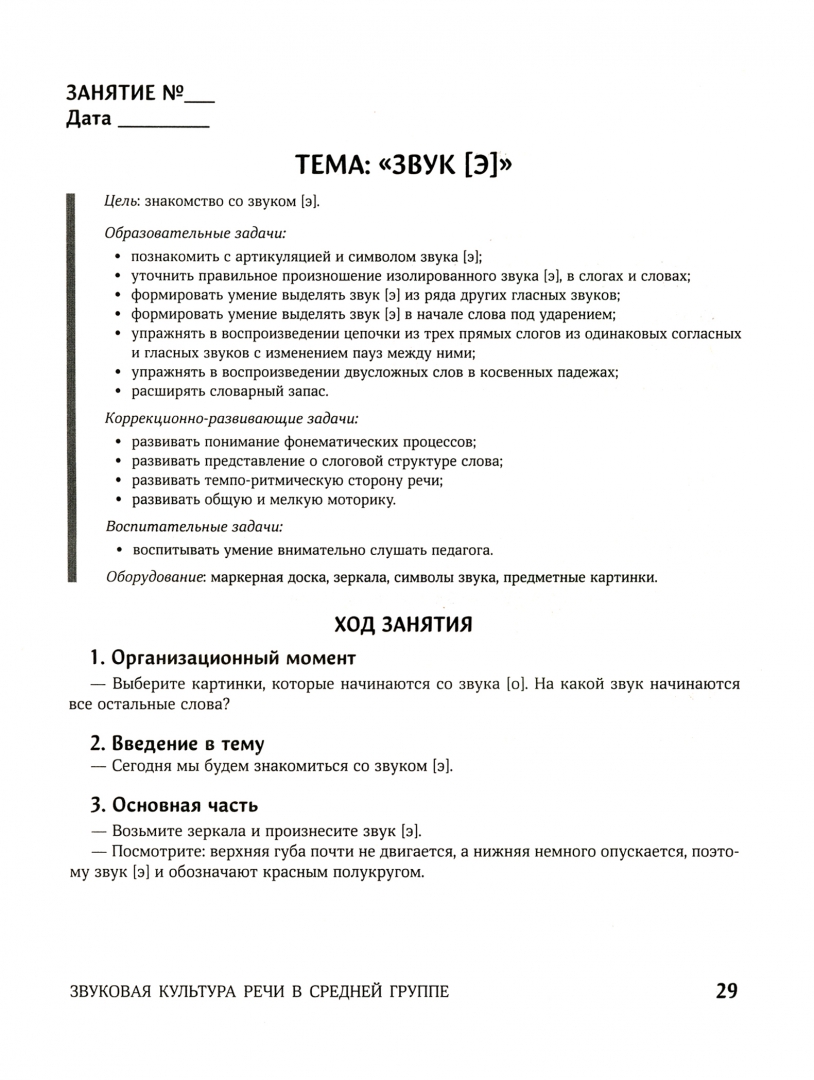 ОписаниеВ данном пособии представлено тематическое планирование и даны подробные конспекты логопедических занятий по звуковой культуре речи для детей средней группы с общим недоразвитием речи. Сборник готовых конспектов логопедических занятий ориентирован на развитие фонетико-фонематической стороны речи у детей среднего дошкольного возраста. Содержание занятий соответствует тем результатам, которых нужно достичь по окончании средней группы детьми с общим недоразвитием речи II и II-III уровня. Материалы предназначены для учителей-логопедов, а также могут использоваться родителями, гувернерами для занятий с детьми при наличии соответствующего наглядного материала.В данном пособии представлено тематическое планирование и даны подробные конспекты логопедических занятий по звуковой культуре речи для детей средней группы с общим недоразвитием речи. Сборник готовых конспектов логопедических занятий ориентирован на развитие фонетико-фонематической стороны речи у детей среднего дошкольного возраста. Содержание занятий соответствует тем результатам, которых нужно достичь по окончании средней группы детьми с общим недоразвитием речи II и II-III уровня. Материалы предназначены для учителей-логопедов, а также могут использоваться родителями, гувернерами для занятий с детьми при наличии соответствующего наглядного материала.