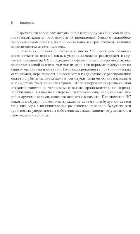ОписаниеВ учебном пособии рассматриваются особенности поведения людей, находящихся в чрезвычайной ситуации, и способы оказания им психологической помощи. Детально обсуждаются виды и способы защит, применяемых во время кризиса и в постстрессовый период, рассматриваются осознанные стратегии поведения, демонстрируемые пострадавшими, очевидцами, родственниками и спасателями. В приложениях к пособию предлагаются методы диагностики личностных свойств, оказывающих влияние на особенности восприятия стрессовой ситуации, методы диагностики поведения в стрессовой ситуации, даются рекомендации по способам саморегуляции и профилактики стрессовых расстройств.Издание предназначено для студентов педагогических вузов, занимающихся проблемами безопасности личности, специалистов МЧС и всех лиц, связанных с оказанием помощи в чрезвычайных ситуациях и преодолением их последствий. Гриф УМО.В учебном пособии рассматриваются особенности поведения людей, находящихся в чрезвычайной ситуации, и способы оказания им психологической помощи. Детально обсуждаются виды и способы защит, применяемых во время кризиса и в постстрессовый период, рассматриваются осознанные стратегии поведения, демонстрируемые пострадавшими, очевидцами, родственниками и спасателями. В приложениях к пособию предлагаются методы диагностики личностных свойств, оказывающих влияние на особенности восприятия стрессовой ситуации, методы диагностики поведения в стрессовой ситуации, даются рекомендации по способам саморегуляции и профилактики стрессовых расстройств.Издание предназначено для студентов педагогических вузов, занимающихся проблемами безопасности личности, специалистов МЧС и всех лиц, связанных с оказанием помощи в чрезвычайных ситуациях и преодолением их последствий. Гриф УМО.