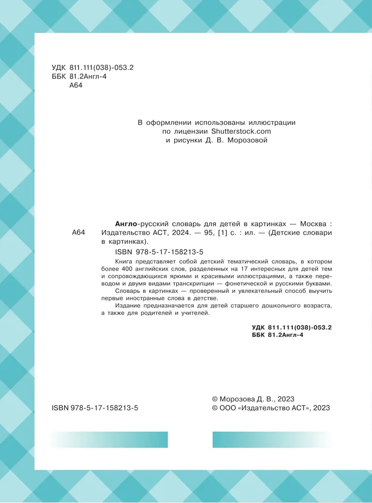 Объем, стр. 96 ISBN 978-5-171-58213-5 Автор Морозова Д. Художник Морозова Д. Серия Детские словари в картинках Язык Русский, Английский Минимальный возраст 0+ Год издания книги 2024 Тип обложки Твердый переплет Иллюстрации Цветные Вес, г 552г Размеры 290х215х12 мм - Отзывы