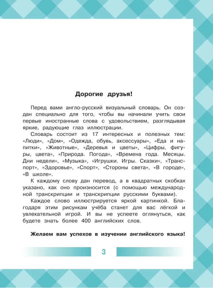ОписаниеКнига представляет собой детский тематический словарь, в котором более 400 английских слов, разделенных на 17 интересных для детей тем и сопровождающихся яркими и красивыми иллюстрациями, а также переводом и двумя видами транскрипции - фонетической и русскими буквами.Словарь в картинках - проверенный и увлекательный способ выучить первые иностранные слова в детстве.Издание предназначается для детей старшего дошкольного возраста, а также для родителей и учителей.