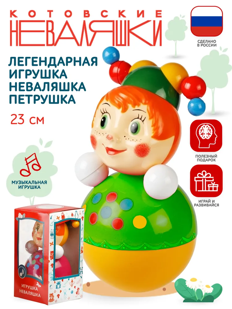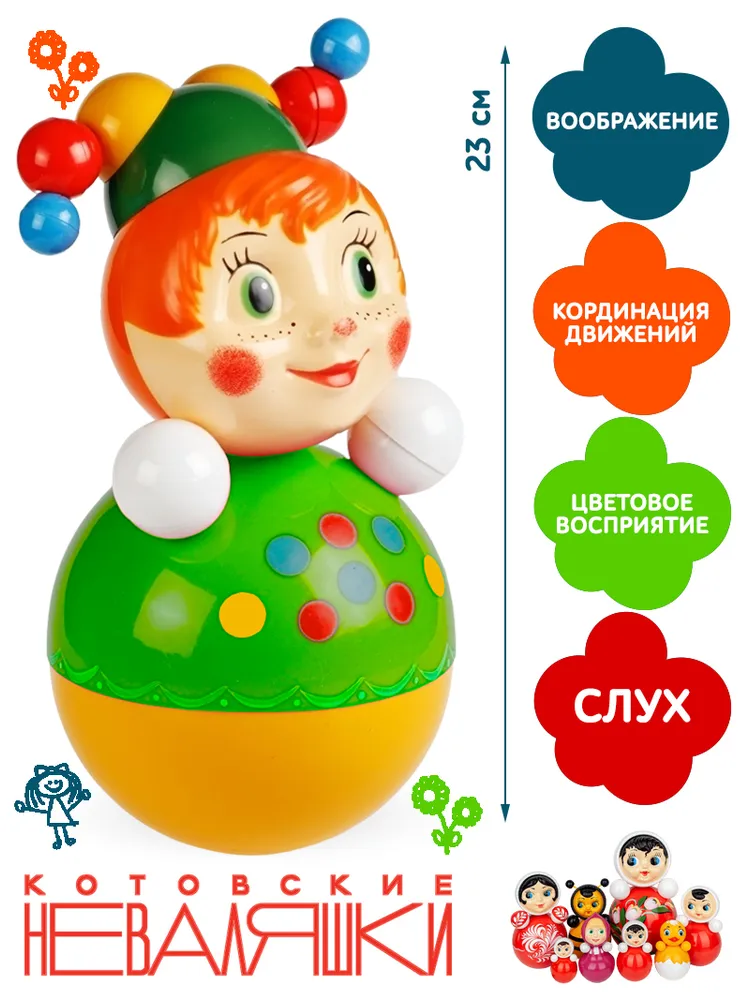 Педагоги и психологи советуют давать Неваляшку детям с шести месяцев, поскольку она развивает зрение, слух и координацию движений; а мелодичный звук, напоминающий колокольчик русской тройки, привлекает и удерживает внимание ребенка.