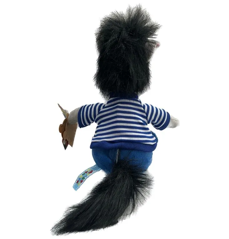 Эта милая игрушка имеет высокое сходство с персонажем: Волк одет в тельняшку, которую можно снять и синие брючки. Глазки пластиковые.