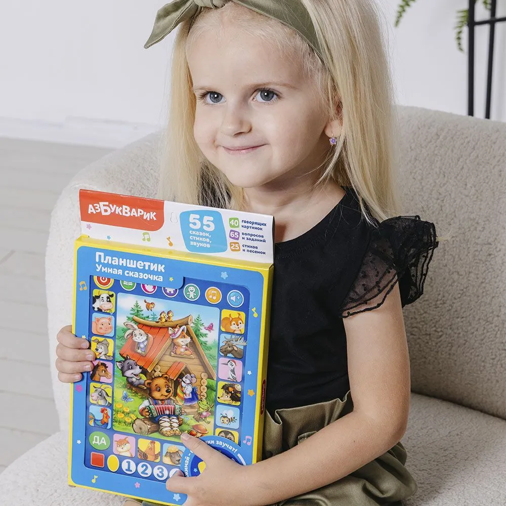 С новым интерактивным планшетиком дети не только послушают любимые сказки, но и выучат цифры, формы и цвета, познакомятся с животными.