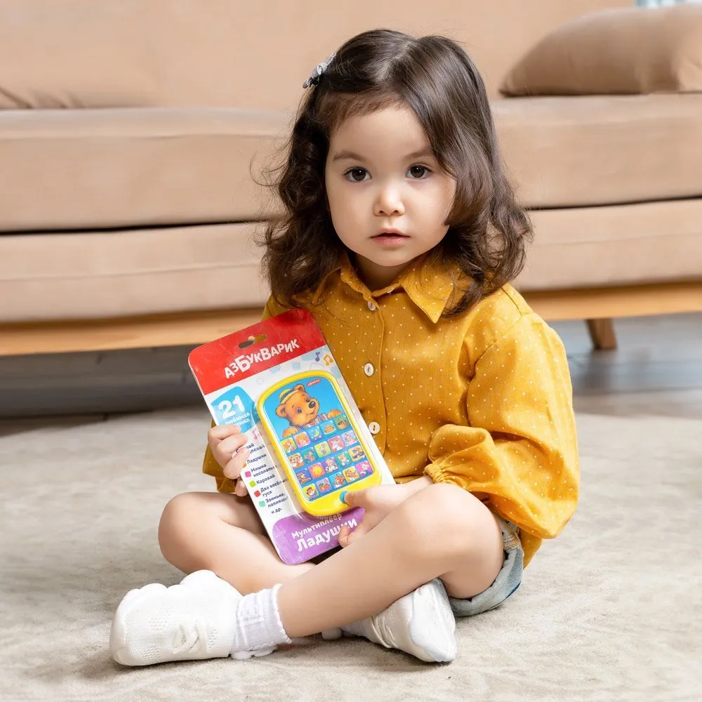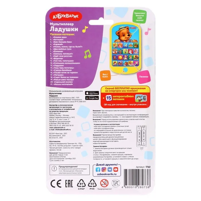 ОписаниеДетям любого возраста нравятся музыкальные игрушки, а наличие разных кнопочек приковывает их внимание и будоражит интерес. Модный мультиплеер торговой марки «Азбукварик» обязательно понравится вашему ребёнку! Ведь он так похож на настоящий смартфон с крупными кнопками на экране! Нажимая на иконки, малыш сможет послушать куплеты и припевы из русских мультфильмов и подпеть любимым героям! Игрушка выполнена из лёгкого пластика высокого качества, имеет небольшой размер и скруглённые края, поэтому держать плеер в детских ручках удобно и безопасно. Мультиплеер «Ладушки» воспроизводит 20 песенок: «Кошкин дом». «Два весёлых гуся». «Топ-топ, топотушки». «Пошёл котик на торжок». «Антошка». «Калинка». «Солнышко-колоколнышко». «Петушок». «Баю-баюшки-баю». «Заинька, попляши!». «Ладушки». «Сидит белка на тележке». «Каравай». «Идёт коза рогатая». «Тень-тень-потетень». «Раным-рано поутру». «Мишка с куклой пляшут полечку». «Водичка». «Сорока-белобока». «Серенький козлик».