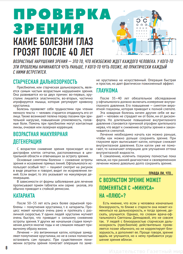 И самое важное, большой блок информации рассказывает о профилактике. Она включает как питание, так и физические нагрузки, впрочем, внутри журнала вы найдете достаточно информации о здоровом образе жизни в целом. Опытные врачи на страницах журнала рассказывают о методах лечения и предупреждения различных болезней и о том, как проще перенести хронические заболевания. Основные принципы этого издания - достоверность и информативность. -