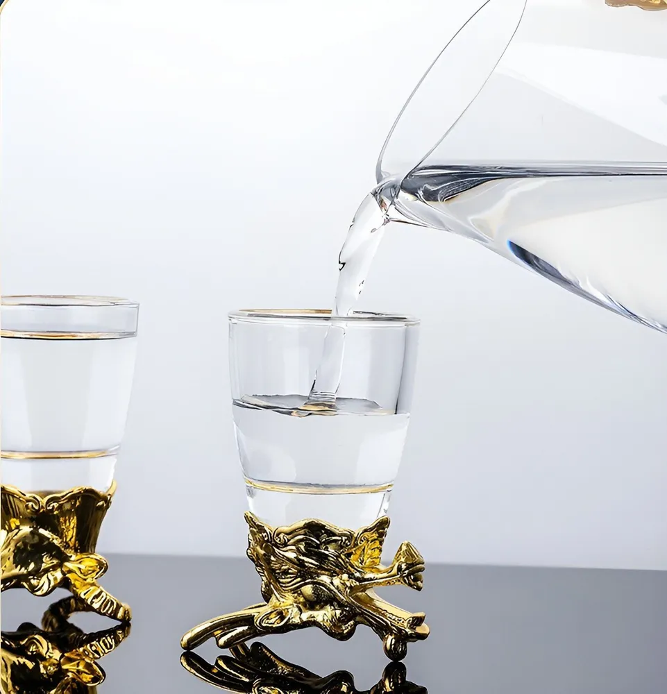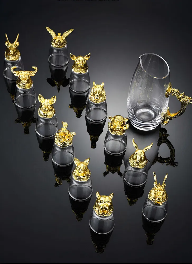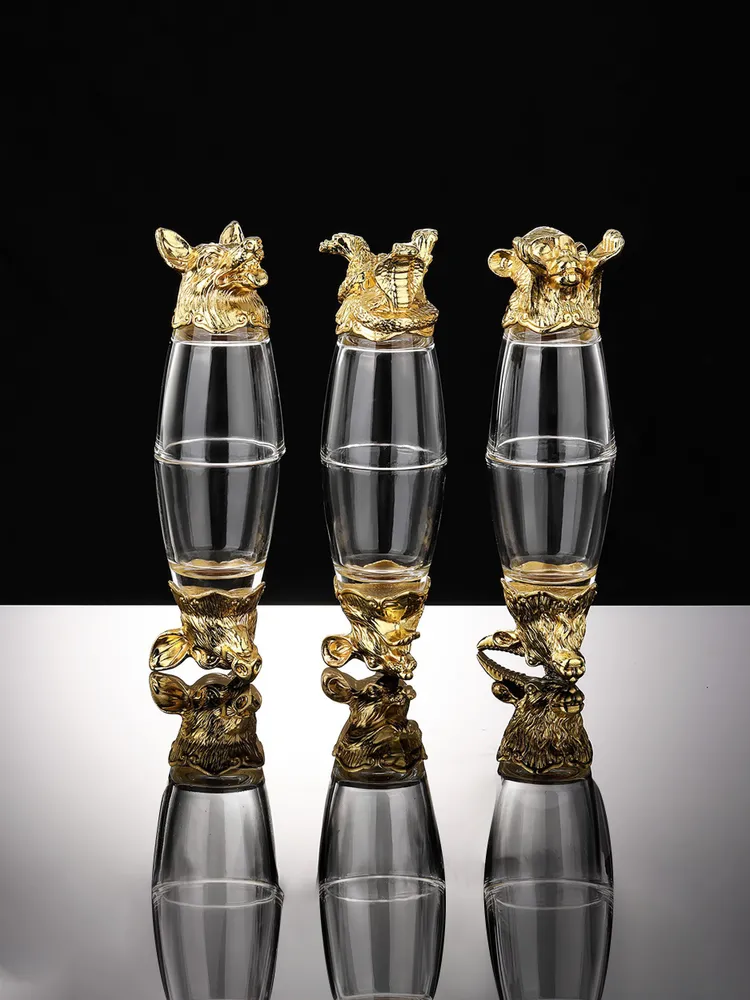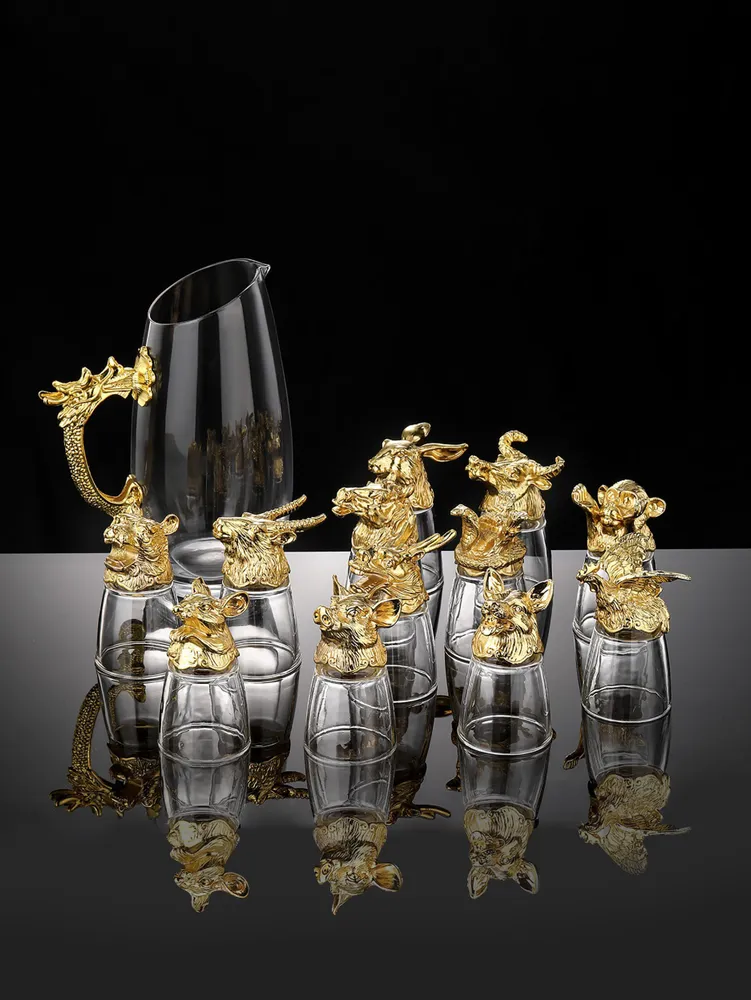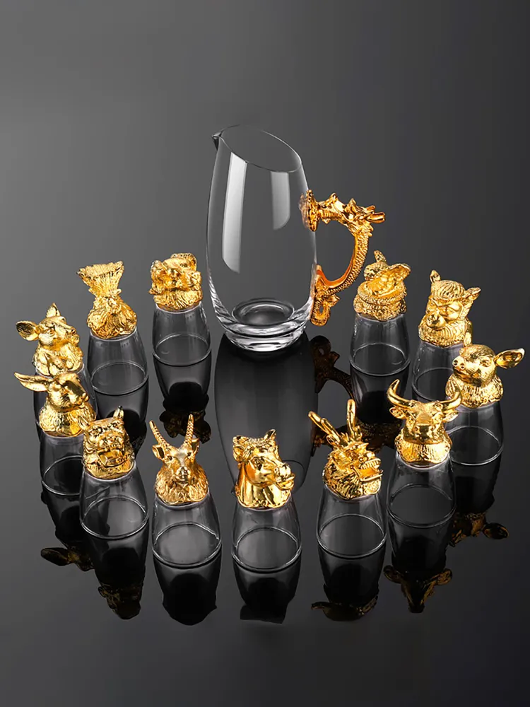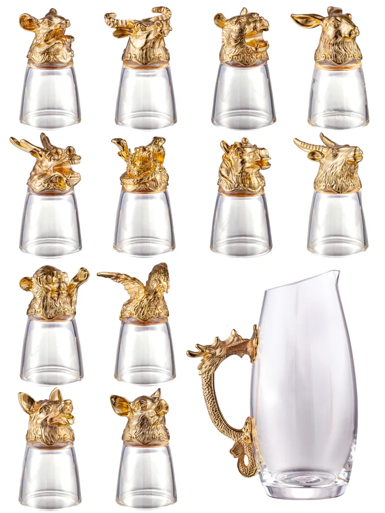 Их насыщенный золотой цвет станет украшением для интерьера любого дома, будет радовать гостей и напоминать о вашем внимании и оригинальности. Основание каждой стопки выполнено в форме 12 животных по восточному календарю. Набор надежно упакован в стильный подарочный короб с ложементом. Такой подарок станет приятным сюрпризом и оставит незабываемые впечатления на долгие годы. Этот эстетичный набор стопок и графина будет выглядеть уместно на ДР, юбилей, профессиональный праздник, Новый год и даже как дружеский презент, особенно для истинных ценителей культуры потребления алкогольных напитков.