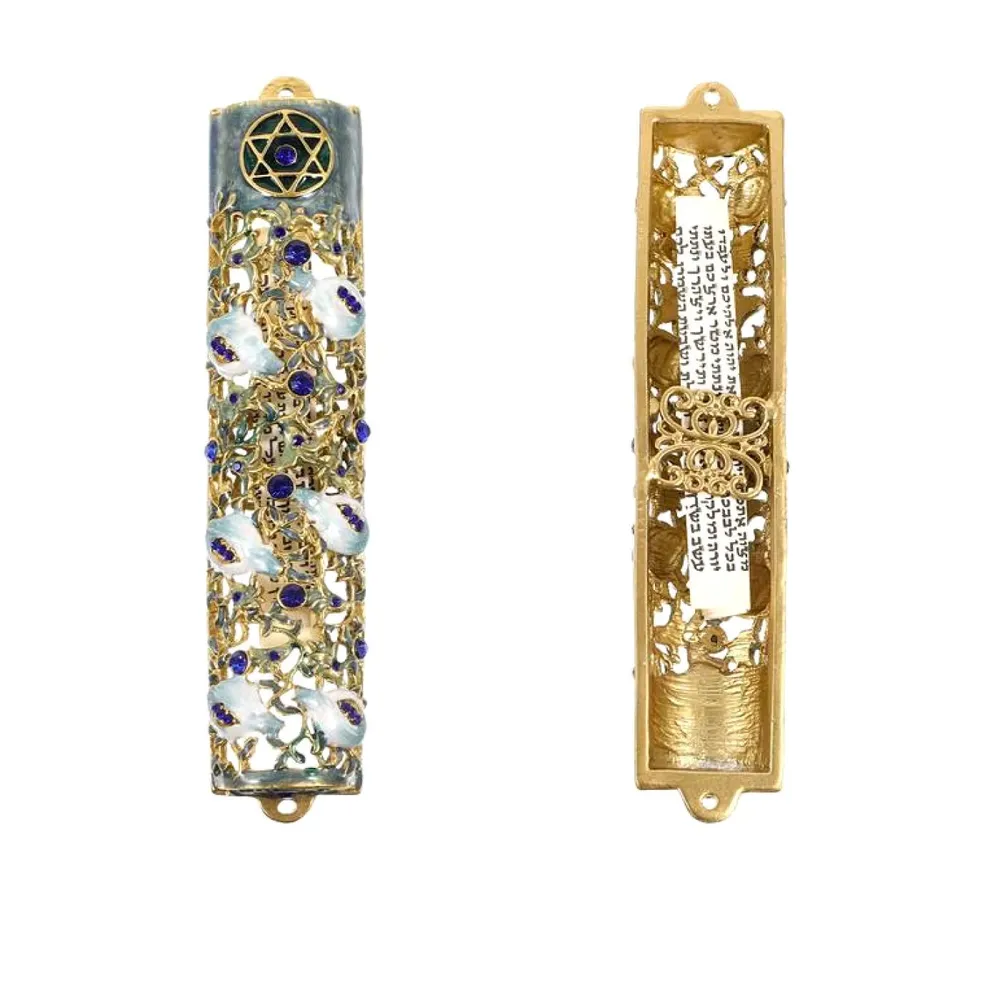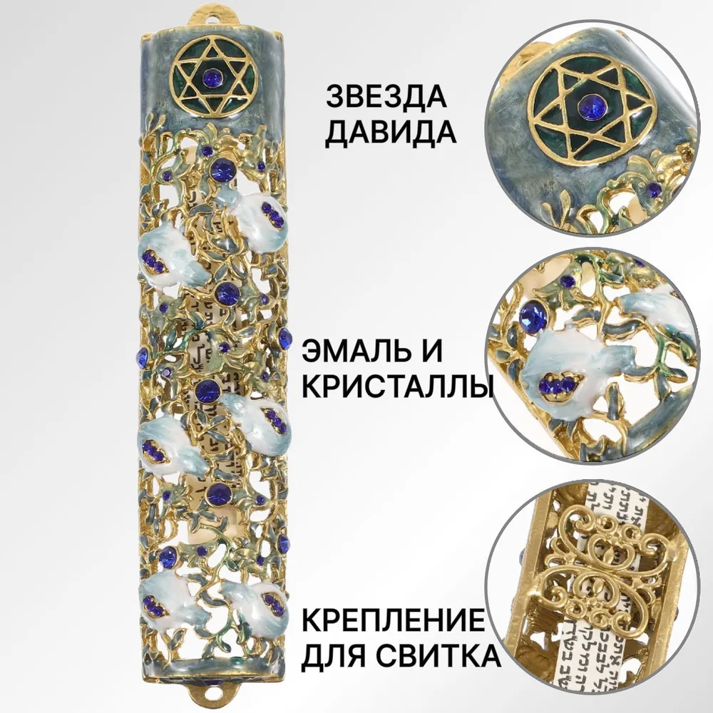 ОписаниеВ иудаизме мезуза — прикрепляемый к косяку двери в еврейском доме свиток пергамента, содержащий часть текста молитвы «Шма». Пергамент сворачивается и помещается в специальный футляр, в котором затем прикрепляется к дверному косяку жилого помещения еврейского дома с правой стороны от двери, крепится она к каждому дверному проему, в том числе и на террасу и на балкон (исключение: ванная и туалет). Домик для клафа будет надежно хранить священный свиток Вашего дома и радовать своей красотой на протяжении долгого времени. Установив по всем правилам молитву на дверном косяке, еврей заручается Божественной охраной, которая будет сопровождать жителя этого дома даже вне жилища. При переезде в новый дом или квартиру благословенная мезуза устанавливается безотлагательно. Если переезд осуществляется в арендованное жилье, то ее прикрепляют, если семья планирует обосноваться в нем надолго, более чем на 30 дней. Домик предохраняет пергамент от всего, что может ей повредить: от сырости, солнечных лучей и т.п. Если хоть одна буква текста сотрется ,она вся станет негодной. В принципе, клафу можно просто завернуть в полиэтилен, однако многие авторитеты считают, что будет лучше, если и вид самого корпуса будет особенным, напоминающим о заповеди помещать слова Торы на входе в дом. Поэтому за многие века сложилось отдельное направление в прикладном искусстве — изготовление футляров для клафа. Они бывают самых различных форм и размеров. Но главное — это свиток, на который нанесены два отрывка из Торы с упоминанием заповеди, домик лишь оформление. По традиции, на футляре крупным шрифтом пишется буква (шин) — первая буква одного из имен Всtвышнего — Ш-а-д-а-й. Некоторые, при выходе из дома, кладут руку на оберег с молитвой и произносят: «Господь охранять будет исход твой и приход твой отныне и вовеки». Человек обычно погружен в рутину повседневности, но когда он проходит к себе в дом, глядя на мезузу, он вспоминает о милости Творца, давшего заповеди в книге Торы, спасшей еврейский народ. Этот знак не дает забыть о пришедших и ушедших. Он позволяет надеяться на милость и мудрость Всевышнего по отношению к ним. Входя и выходя из дома, вспоминают, что Творец вездесущ и всемогущ/
